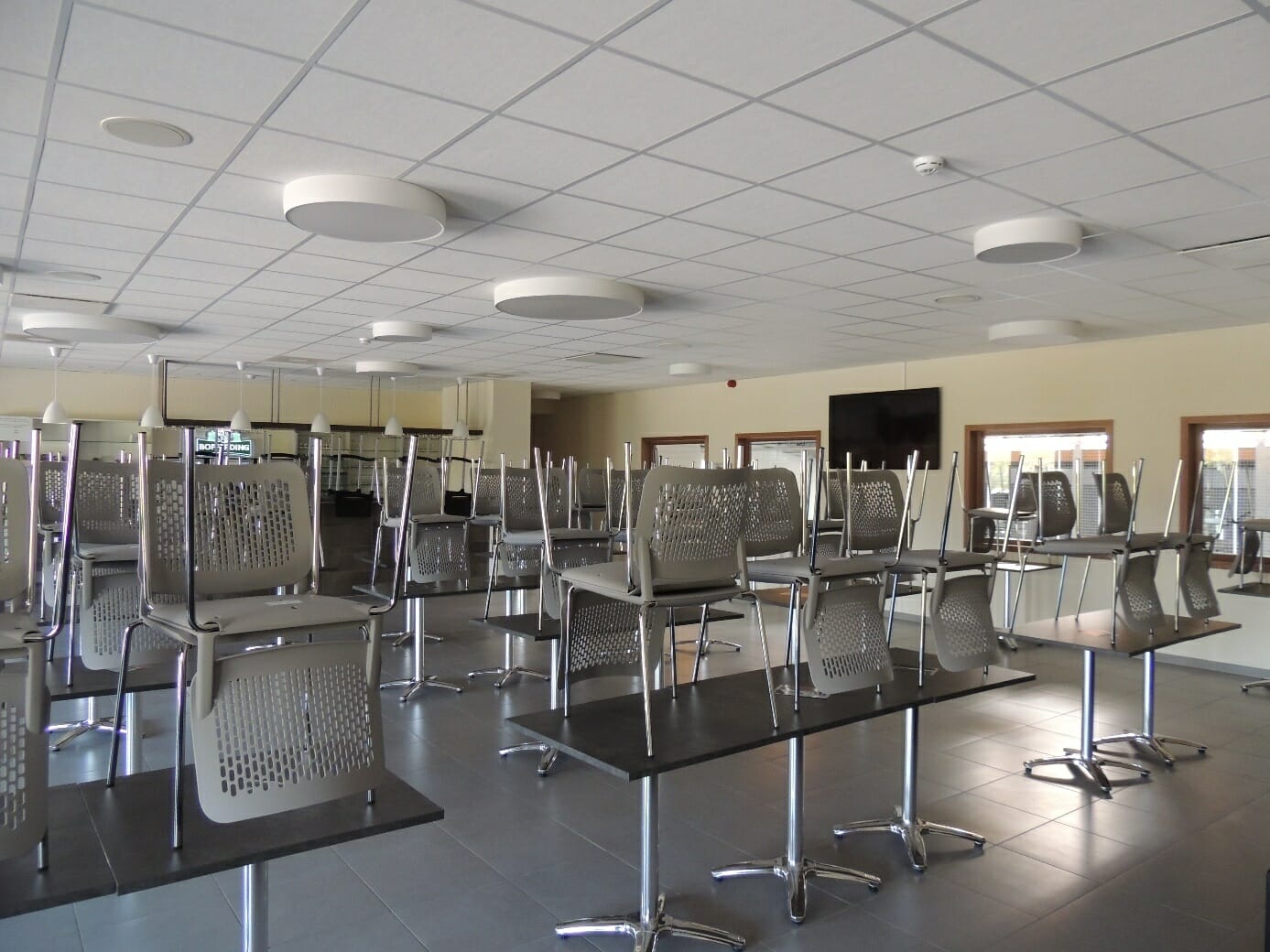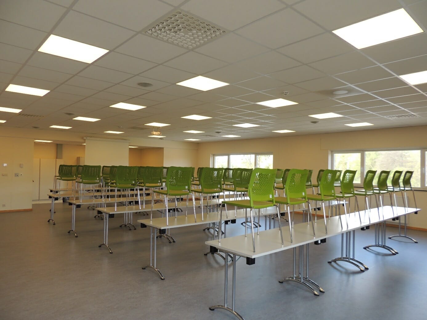 - Salle lumineuse de 44 × 22 mètres, divisible en trois parties avec bâches.